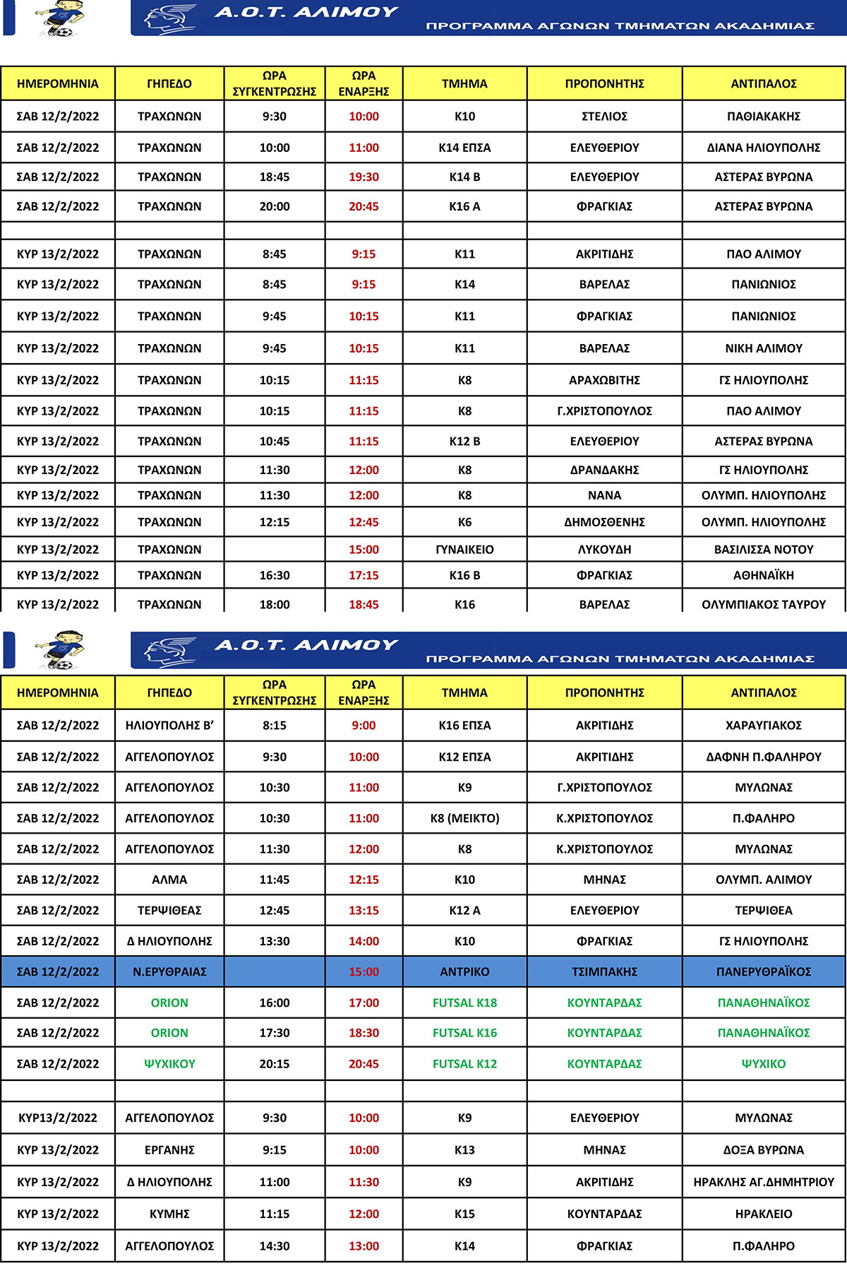 Πρόγραμμα Αγώνων 12-13 Φεβρουαρίου 2022 Written by popi vekri on February 10, 2022. Posted in Uncategorized