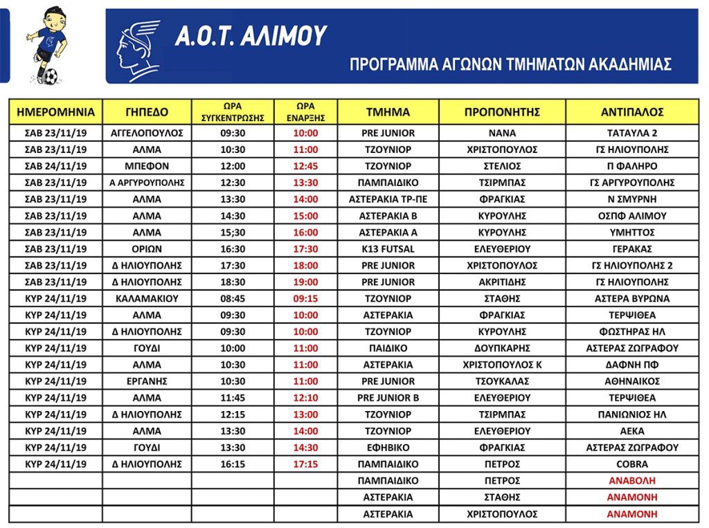 Πρόγραμμα αγώνων 23-24/11/2019
