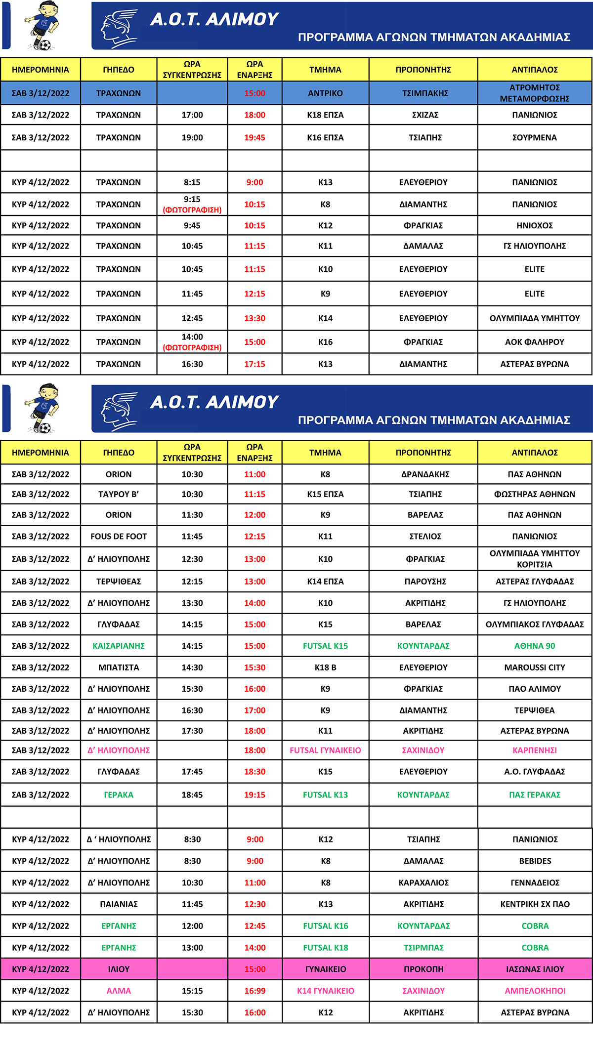 Πρόγραμμα αγώνων 3-4 Δεκεμβρίου 2022 (ΟΡΘΗ ΕΠΑΝΑΛΗΨΗ)