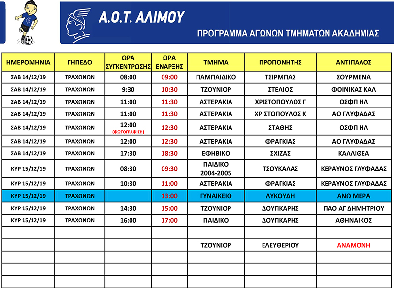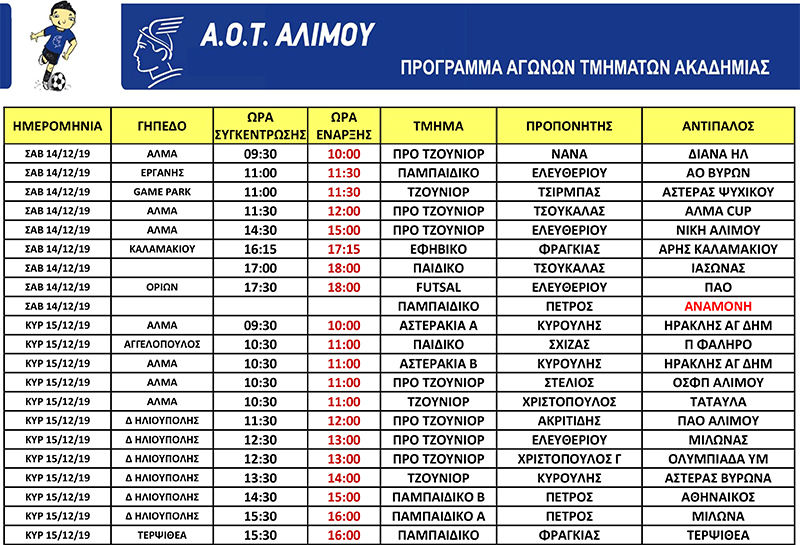 Πρόγραμμα Αγώνων 14-15/12/2019